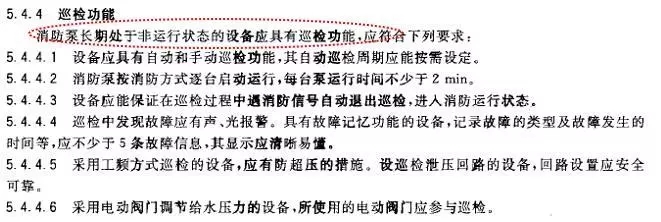 在各個部分標準的前言中,均對該國標的強制執行與推薦執行部分進行了劃分,在各個國標第5章內容描述了對固定給水設備的控制要求,屬于強制執行部分。其中均提到的對消防泵巡檢的要求。下面截取了標準中的描述: